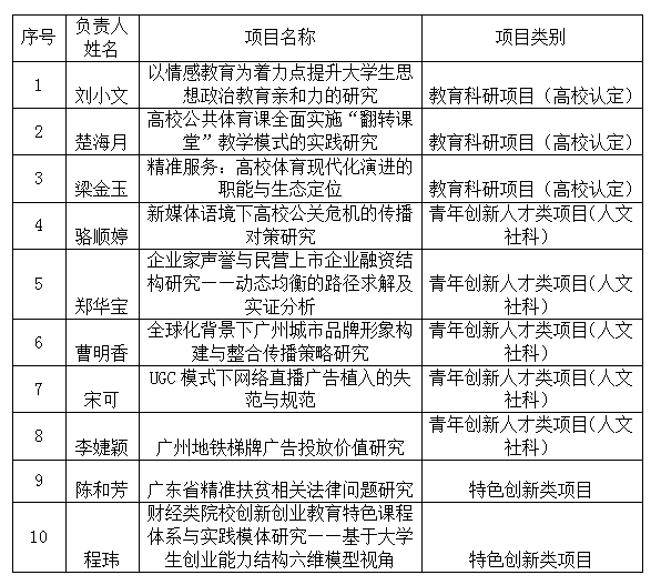 本网讯(科研处 黄柳梅)根据广东省教育厅下发的《广东省教育厅关于公布2017度重点平台及重大科研项目立项的通知》(粤教科函[2018]64号),我校10项课题获批立项。这是我校第四次获得广东省教育厅重大科研项目立项,并且数量最多。这些项目将为我校“创新强校工程”建设及学校的内涵式发展发挥较大的作用,增强我校教职工开展科研创新的主动性和积极性,提升我校自主创新能力。具体立项情况如下: