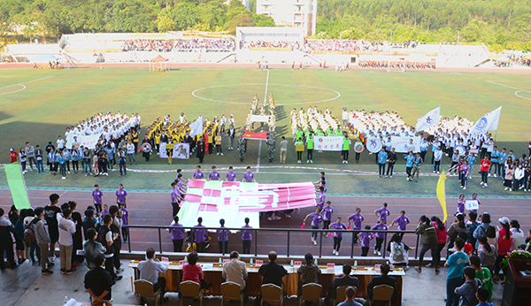 入场仪式上,在国旗和校旗护卫队的引领下,各院系运动员代表高呼口号,踏着整齐的步伐依次进场,完成了精彩的方阵表演。